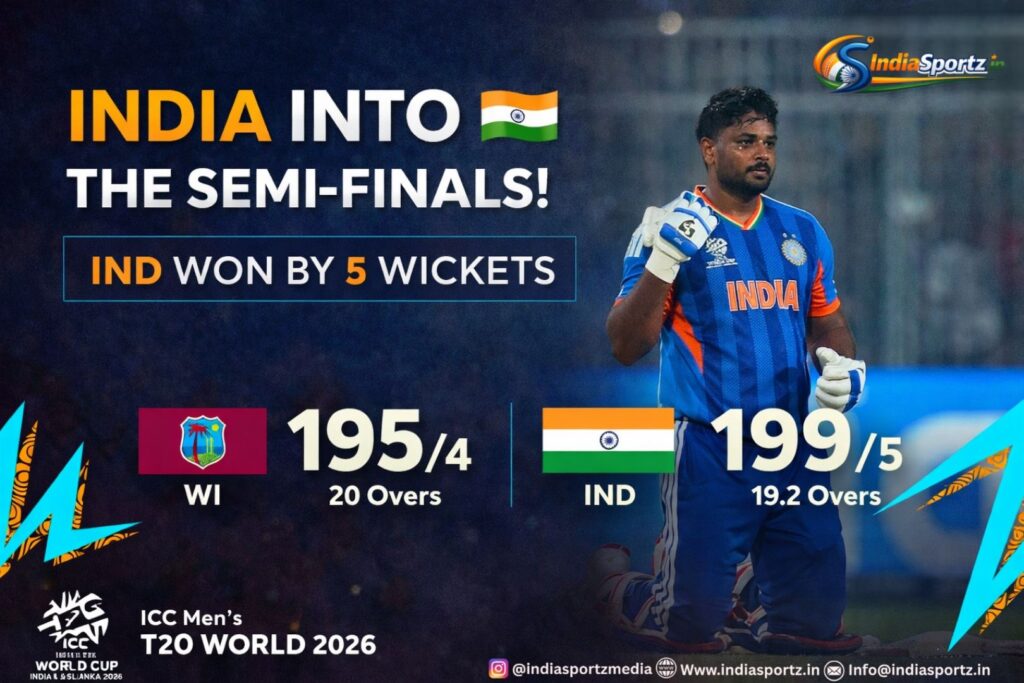 Team India booked their place in the semi-finals of the ICC Men’s T20 World Cup 2026 with a commanding five-wicket victory over West Indies in a high-scoring encounter. Chasing a challenging target of 196, India displayed composure and class to seal the match in just 19.2 overs.