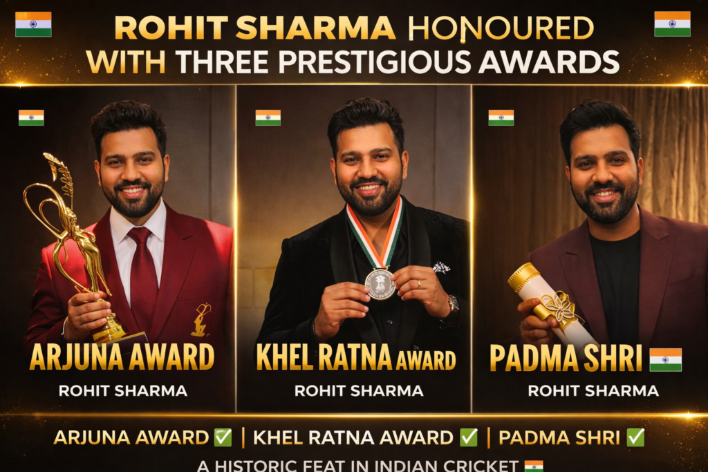 New Delhi: Indian cricket superstar and Team India captain Rohit Sharma has achieved a historic milestone by being conferred with three of India’s most prestigious honours — the Arjuna Award, the Major Dhyan Chand Khel Ratna Award, and the Padma Shri Award. This rare honour places Rohit Sharma among the most decorated sportspersons in the history of Indian sports.